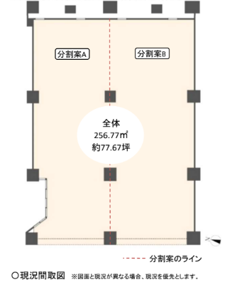 | 募集フロア | □専有面積256.77㎡(約77.67坪) □1フロア(スケルトン・現状渡し可)□分割可 分割案 A:約119.83㎡(約36.25坪) B:約136.92㎡(約41.42坪) |
